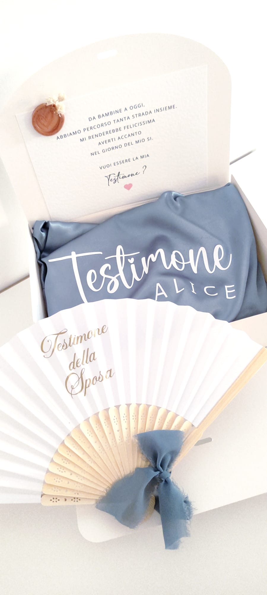 Questa elegante box personalizzata racchiude una vestaglia raffinata in raso e un ventaglio coordinato con il ruolo, entrambi personalizzati e coordinati tra di loro.