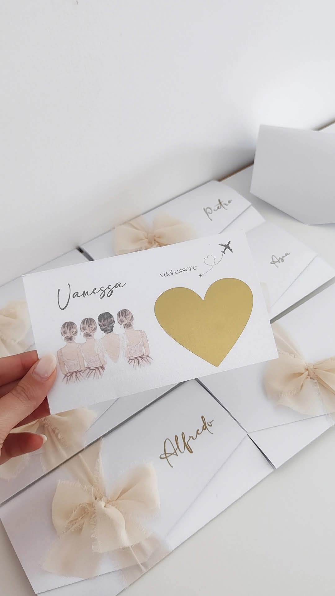 Sono racchiusi all'interno di una raffinata busta realizzata a mano in carta pregiata e con fiocco in chiffon.