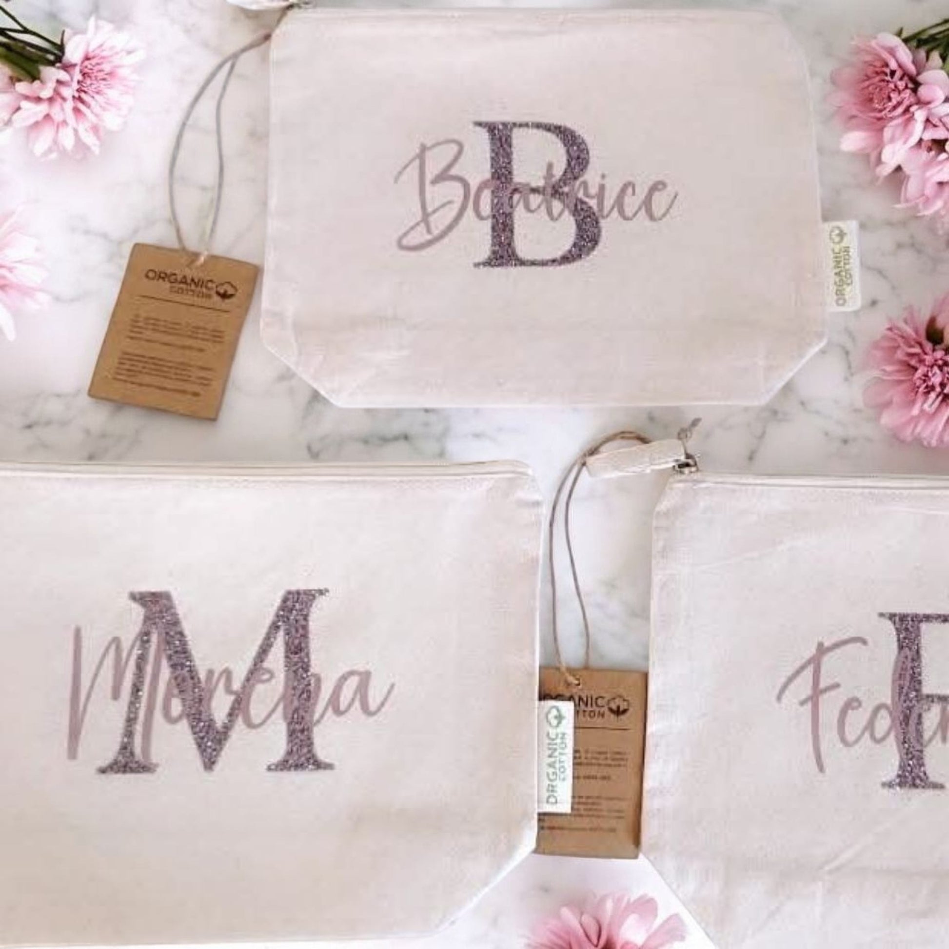 Realizzata in cotone organico di alta qualità, questa pochette personalizzata unisce eleganza e praticità. Perfetta per contenere accessori per la cura personale o come raffinato dettaglio da inserire nelle box dedicate a damigelle e testimoni.