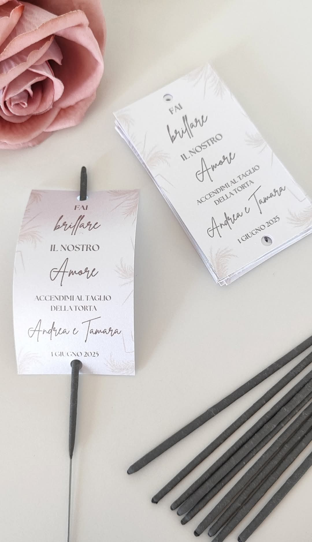 Ogni scintilla è arricchita da un’elegante fascetta personalizzabile con nomi, data, frasi d’amore o grafiche a tema, per rendere unico anche il più piccolo dettaglio.