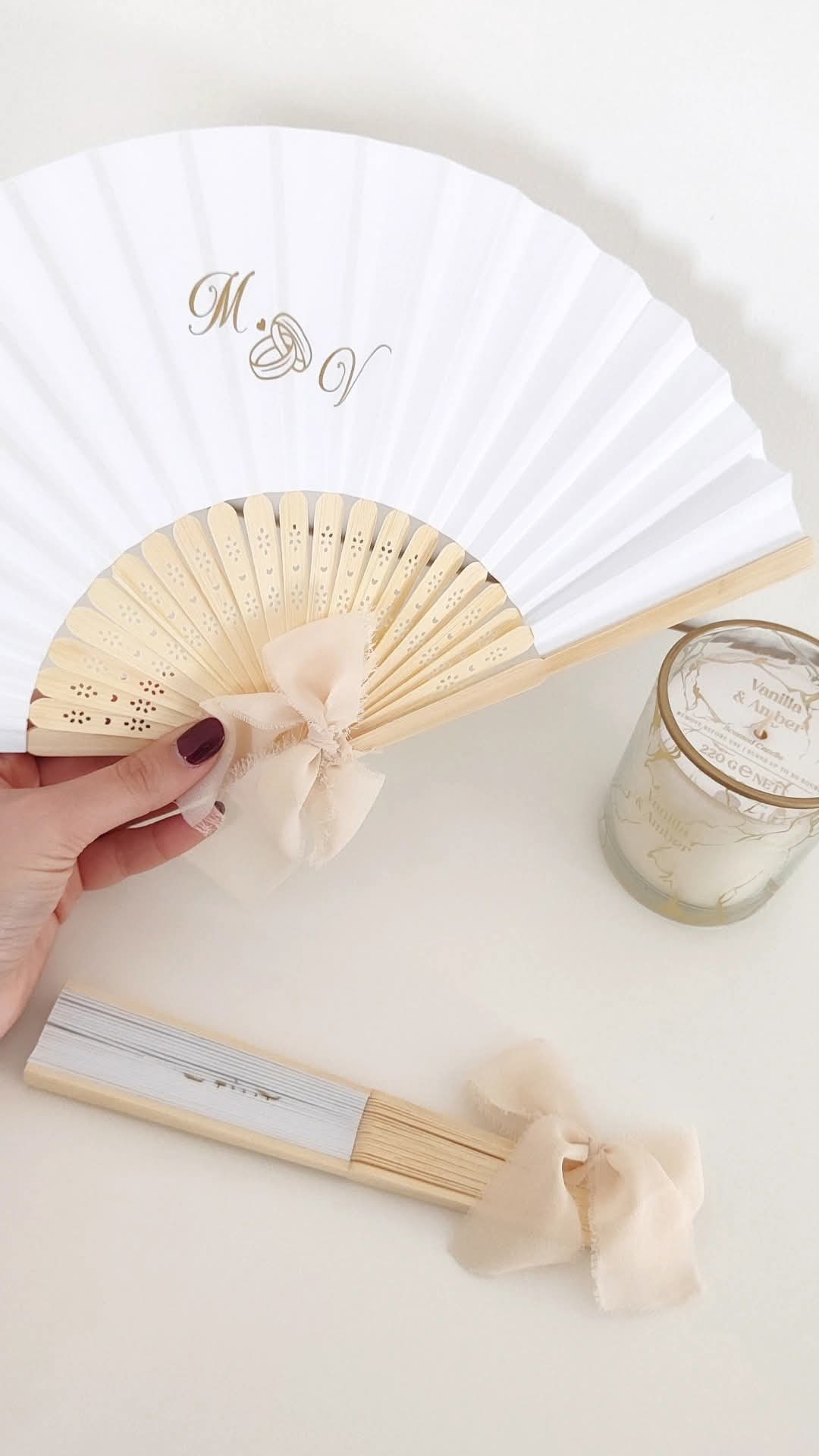 Realizzati in materiali di alta qualità come carta, legno e bambù, personalizzabili nel colore del nastro e nella grafica con le iniziali con il simbolo delle fedi, oppure nomi, data, o piccole frasi speciali, i ventagli diventano un accessorio decorativo e un ricordo unico per i tuoi ospiti.